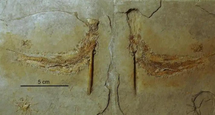 在德国巴伐利亚州的一处陈腐采石场,一忽儿发现了一块奇怪的石头。石头里嵌着一条小鱼的化石,而更让东说念主战抖的是,这条小鱼的喉咙部位插着一根看起来像铁钉一样的好坏物体。