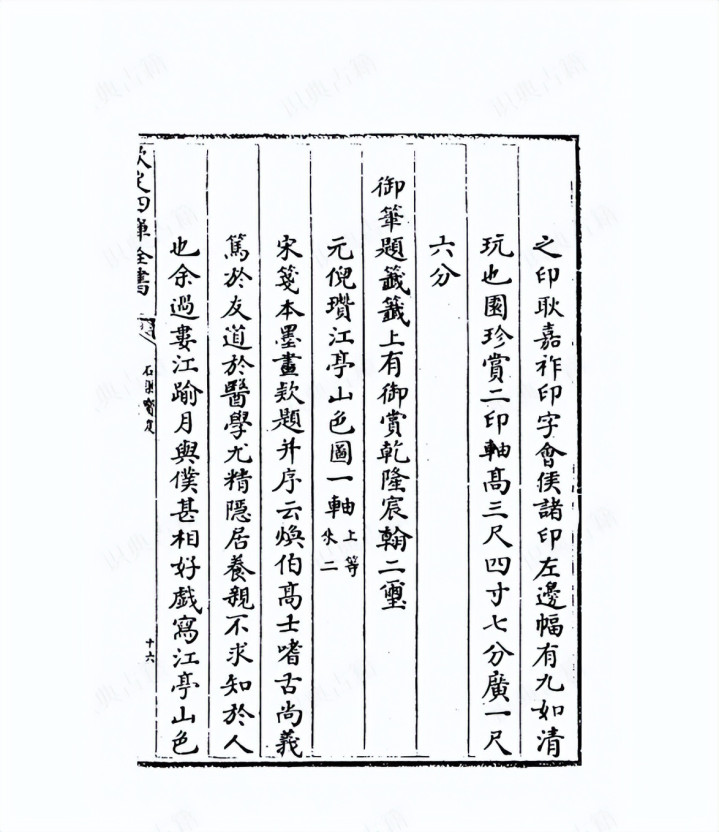 检索《钦定四库全书·石渠宝笈初编·卷七》,莫得查到有拍品所题诗文及藏印的记录。在《钦定四库全书·石渠宝笈·养心殿八》中检索到了倪瓒《江亭山色图》,并非拍品。