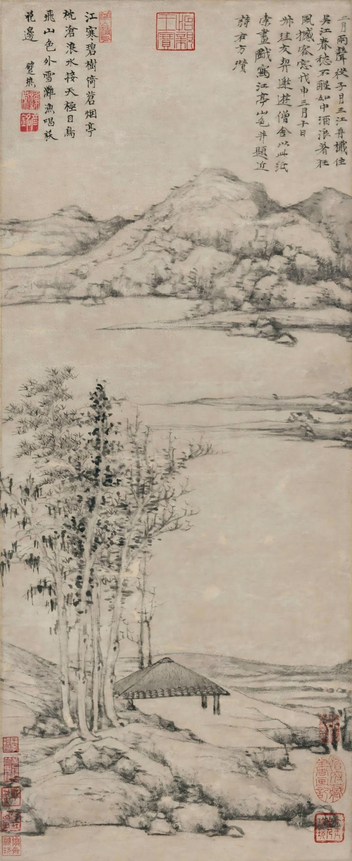 水墨画:左首坡上结亭,远岫映带,自题:二月雨声从子月,三江舟楫住吴江。春愁不醒如中酒,浪著狂風撼客蒽。戊申三月旬日,叔珪友契邀遊僧舍。以此纸索画。戲寫江亭山色。并题近诗右方。瓚。