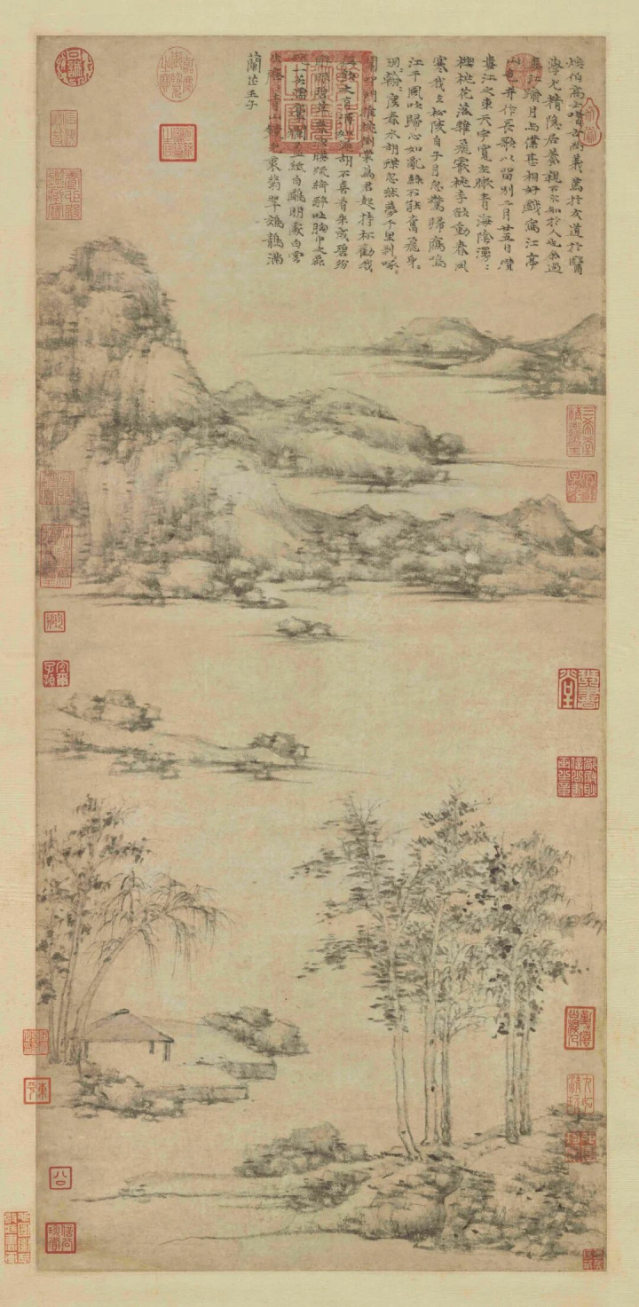 由于拍品中见不到风中柳树,这个伪物不是此次1.6亿的画作。自后的仿冒者为了幸免被《味水轩日志》的记录坏了事,就在抄袭经过中改了画的名字为“江亭山色”图。