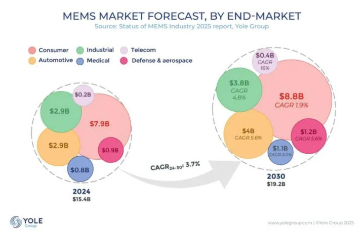 如今,MEMS器件已成为咱们日常生计中不行或缺的一部分,尽管它们的存在频频被东说念主忽略,其应用范围从耳机中的麦克风到用于工业天线踏实的惯性传感器,敩学相长。阐述Yole Group发布的《2025年MEMS产业近况讨教》,瞻望到2030年,MEMS器件市集界限将达到350亿件,营收将达到192亿好意思元,2024年至2030年的复合年增长率(CAGR)为3.7%。