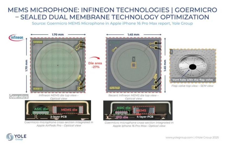 最近,Yole Group的分析师发现了一种新的密封双膜XSENSIVE™ 麦克风绸缪,该麦克风由英飞凌科技开发,并应用于歌尔微的居品中。