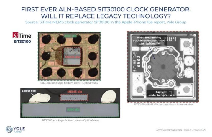 SiTime公司发布了其Symphonic™ SiT30100时钟发生器,该器件基于MEMS谐振器,提供四个时钟输出。它已取代iPhone 16e和17 Air中的传统石英技巧,并与苹果的C1调制解调器合作使用。该器件承袭10引脚芯片级封装,面积仅为2.22平淡毫米,可结束更高的集成密度。